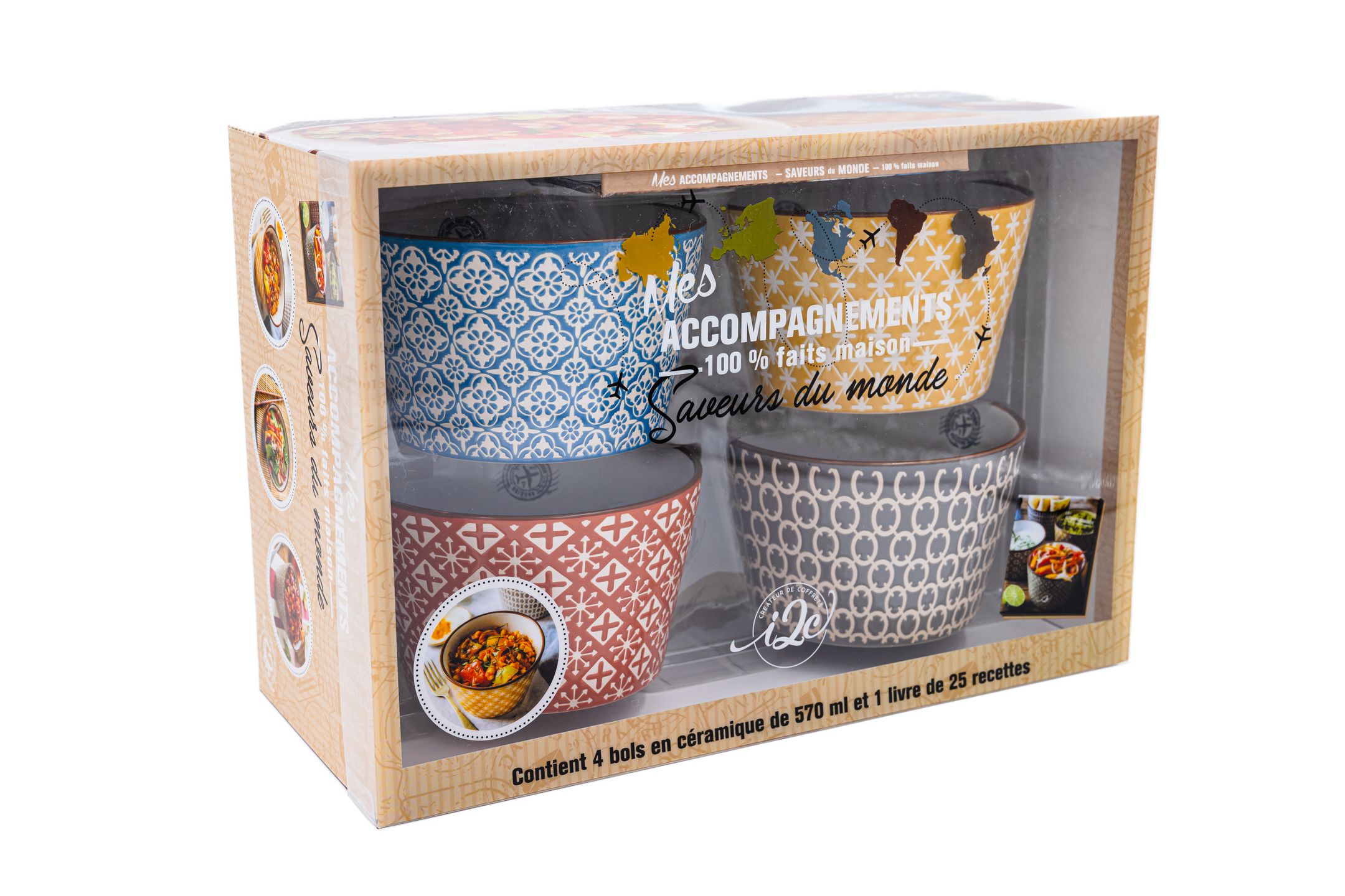 Le coffret « Mes Accompagnements du monde » vous propose de partir dans un voyage de saveurs à travers 25 recettes - 5 recettes par continent- parcourez ainsi l’Asie avec des Nouilles sautées aux légumes Chop suey, l’Afrique avec un Mafé de patates douce ou encore l’Amérique du nord avec des mac and cheese … à déguster dans 4 très beaux bols aux motifs colorés, en céramique de haute qualité, qui peuvent passer au four traditionnel ou au four à micro-ondes, pour un gain de temps et d'organisation !