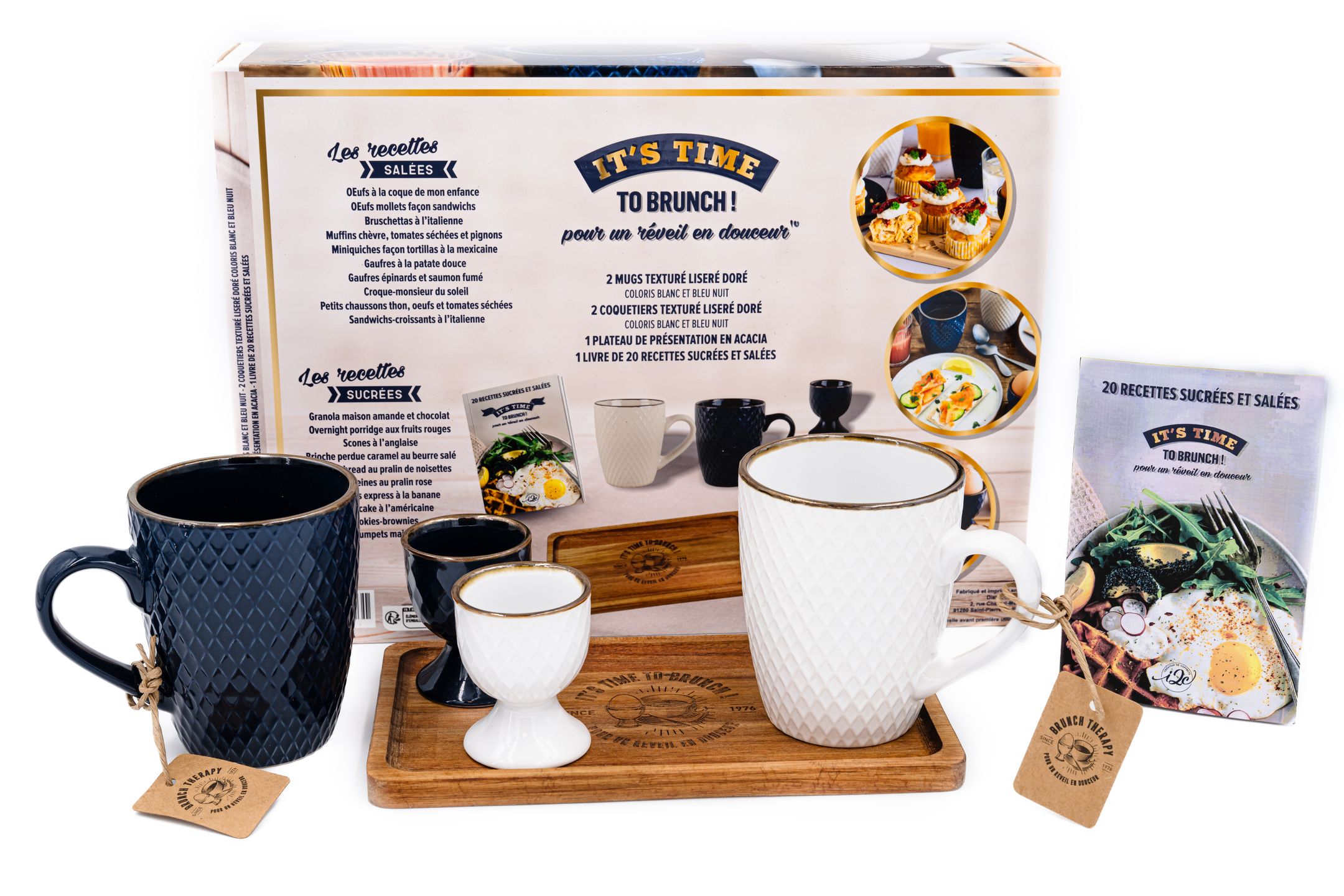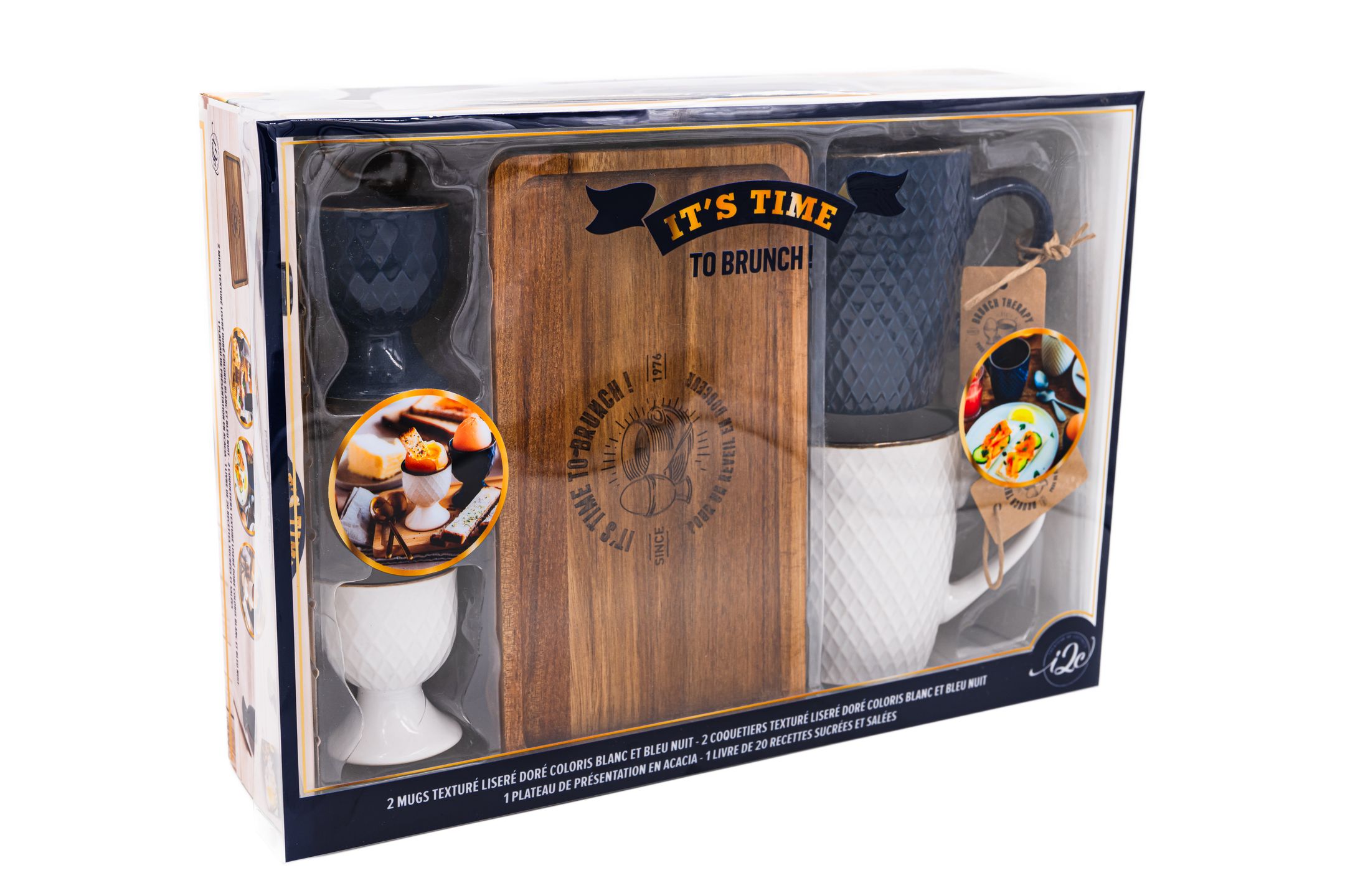 Le coffret est composé de 2 tasses et de 2 coquetiers en céramique haute qualité embossés, aux coloris crème et bleu nuit, soulignés d’un élégant liseré doré (compatible avec le micro-ondes), d'un plateau en acacia gravé et d'un livre de 20 recettes.