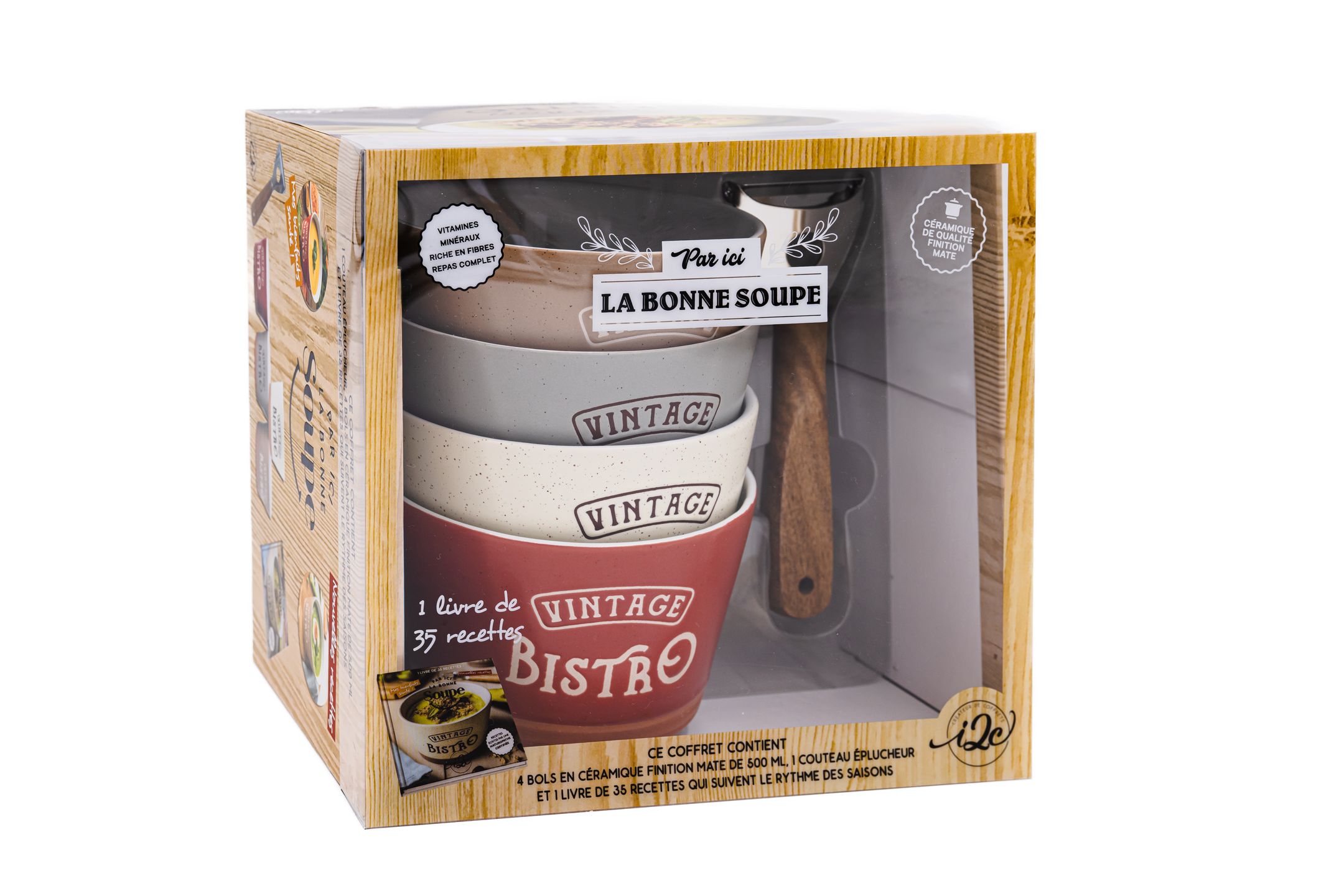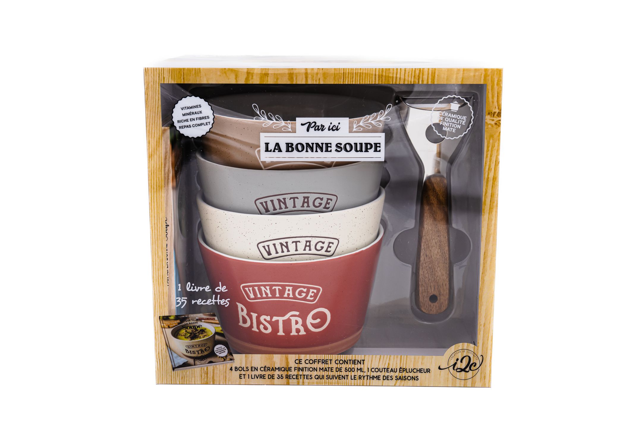 Le coffret Par ici la bonne soupe, permet de réaliser soupes, veloutés et bouillons maison en toute simplicité, et de les déguster dans 4 nouveaux bols aux couleurs et style élégants et contemporains !