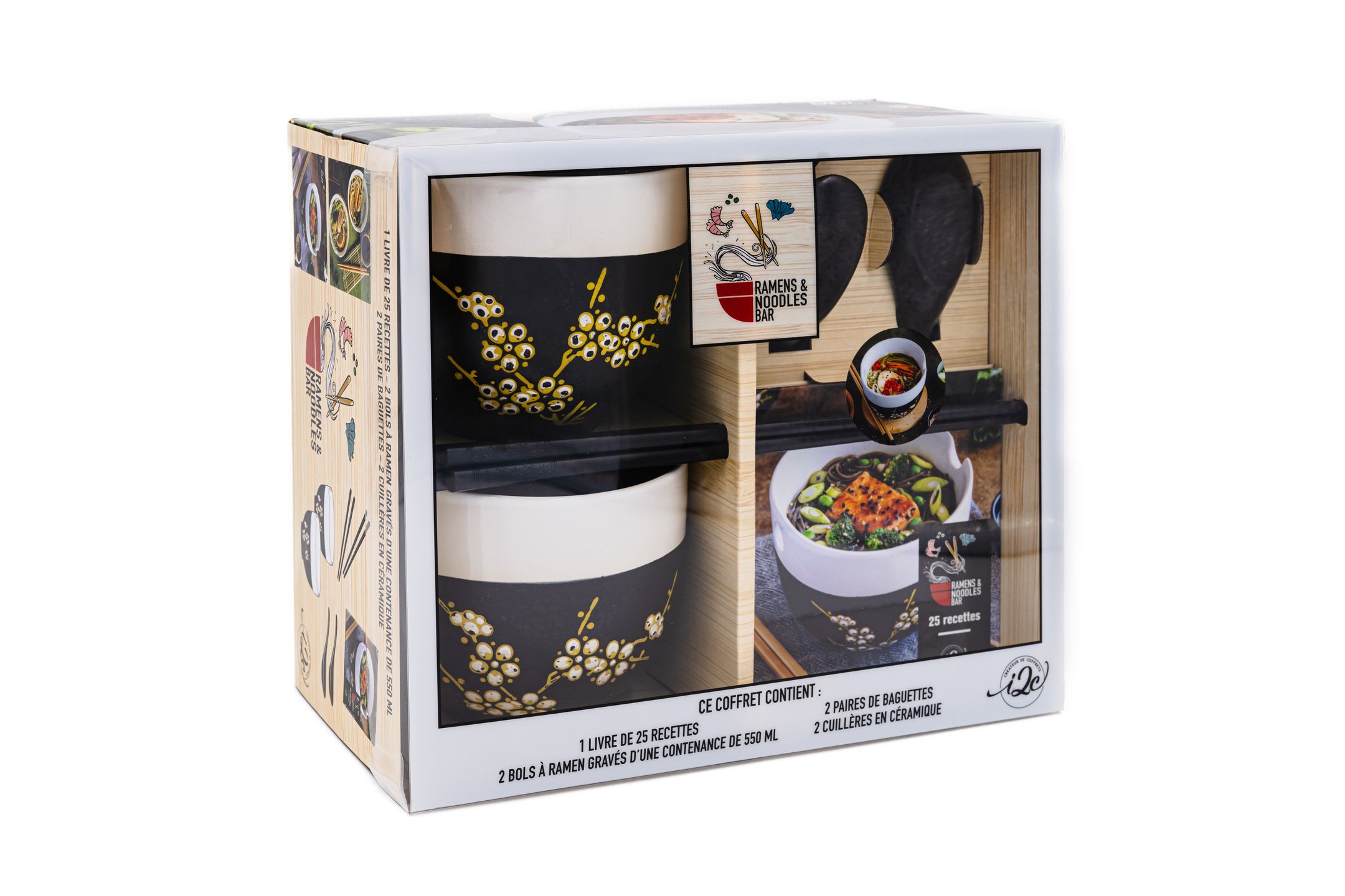 le livre de 25 recettes vous permettra de réaliser de délicieux ramens et autres bouillons à base des différentes pâtes existantes – udon, soba, somen, nouilles….. à déguster dans deux authentiques bols à ramen en céramique de qualité supérieure décoré de fleurs de cerisiers, à l’aide de 2 cuillères en céramique et de 2 paires de baguettes en bambou. Ces recettes traditionnelles raviveront vos papilles : OUMAÏ * (c’est délicieux en japonais)